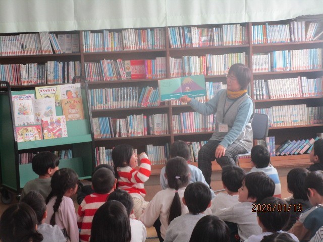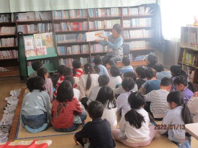 2組の2時間目は図書の時間で、新たな本の貸し出しを行い、図書支援員の方から読み聞かせをしていただきました。年始めの年中行事の絵本を紹介していただき、子供たちは身の乗り出して聞いていました。