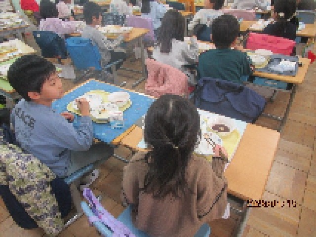今日から給食が始まりました。今日のメニューは、「若草雑炊」など、お正月で疲れた胃腸を休めるために食べる日本の伝統的な行事食です。甘さ控えめの「玉あずき」も出て、子供たちは久しぶりの給食を満喫していました。