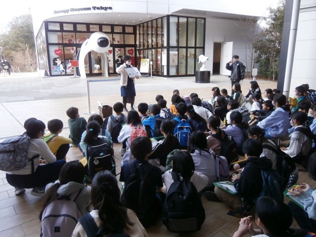 今日の午前中、5年生は英語の授業の一環として、南町田グランベリーパーク内にある「スヌーピーミュージアム」での校外学習が行われました。4クラスのうち、今日は1・2組の子供たちが参加し、館内の展示を参観したり、ワークショップに参加します。まずは、MEPSの先生方の説明をしっかり聞きます。