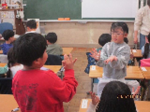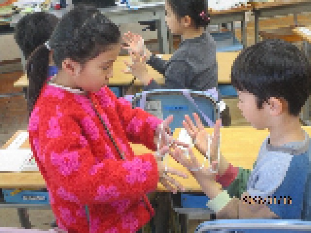 2組の午後5時間目の授業は、生活科の課題で昔遊びについて勉強しました。今日は、あやとり遊びに挑戦し、友達とペアになったり、みんなで技を教え合ったりして楽しんでいました。