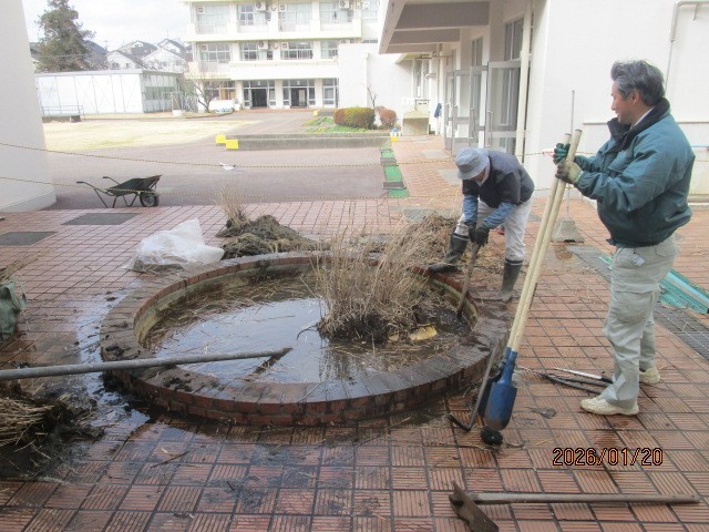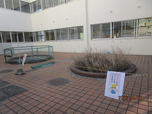 東玄関の脇にある2つの工作物を整備してビオトープにしようと、主事さん方が柵を取り外して中を掃除していただきました。まだまだ形になるまでには時間がかかりそうですが、学習に生かせるようなものになるといいです。