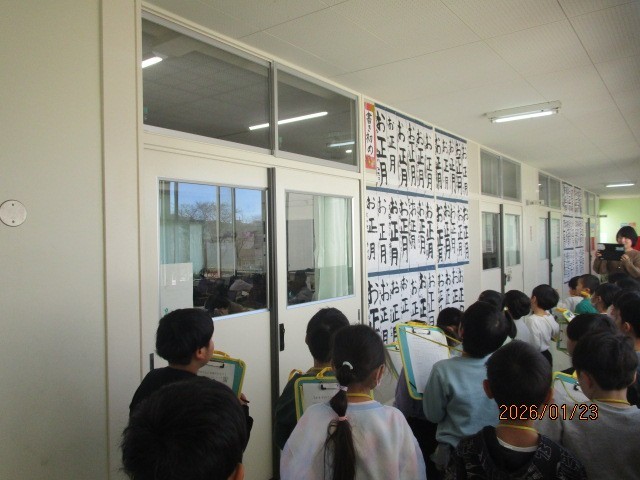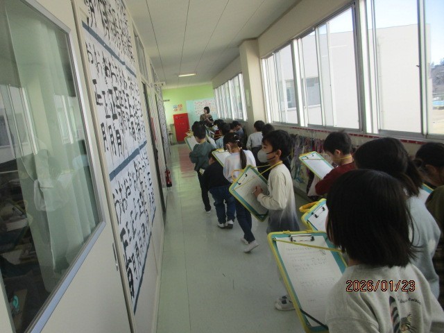 3時間目の2組の子供たちは、廊下に掲示している上級生の書き初めを鑑賞しました。お兄さん・お姉さんの大きくしっかり書かれた毛筆の字に、1年生は圧倒されていました。