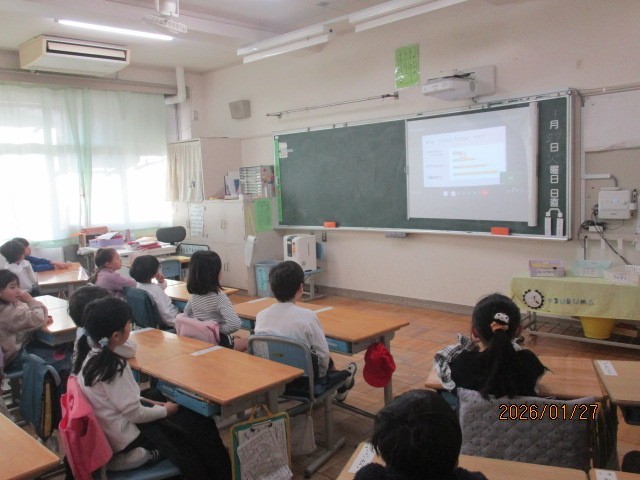 3学期最初の児童集会は、ミートによるクイズ集会です。今年1年をふり返っての学校に関するクイズが出題されました。今年鶴間小学校に来た先生の人数は?図書室の間違え探しなど、趣向を凝らした問題に、それぞれの教室で子供たちは身を乗り出して参加していました。
