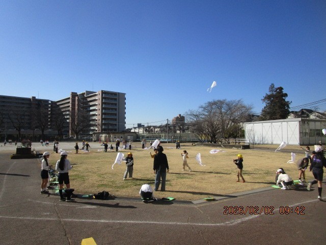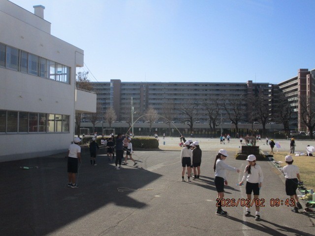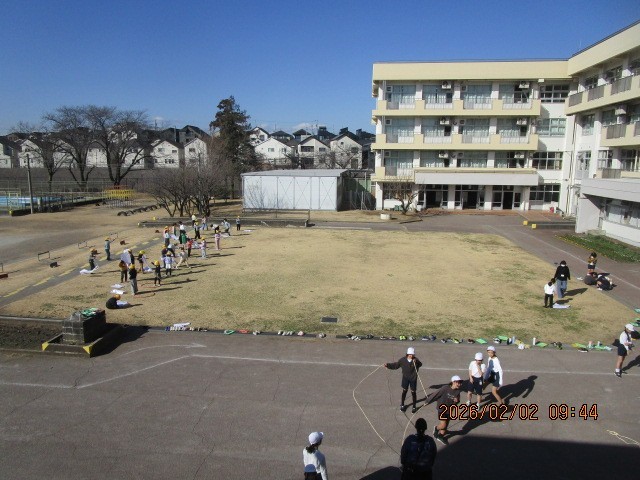 2時間目の校庭をのぞいてみると、いろいろな学年の子供たちの声が聞こえてきます。芝生の所では、1年生が凧揚げを楽しんでいました。その横では、5年生が体育の授業で縄跳びや長縄跳びの練習に励んでいます。校庭のトラックでも、2年生が体育でボールけり運動に夢中になっていました。青空の下、鶴間小の子供たちは元気に体を動かしています。