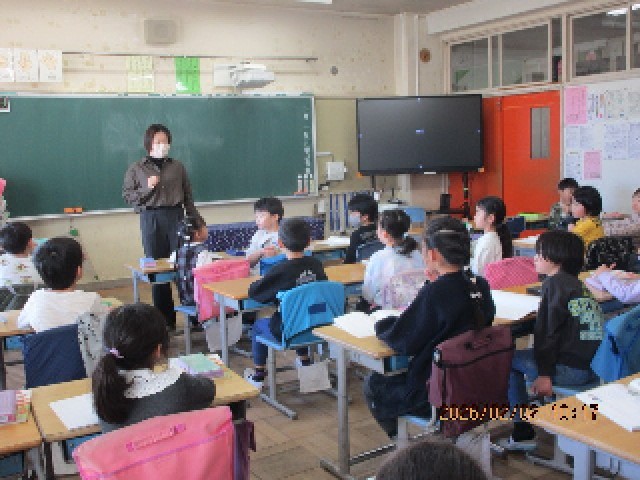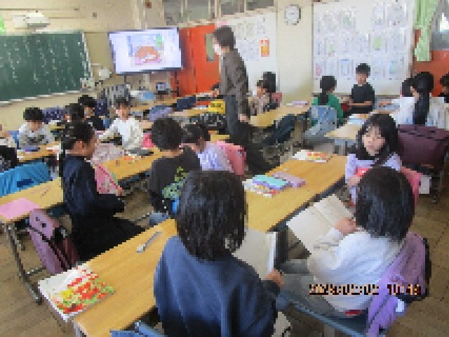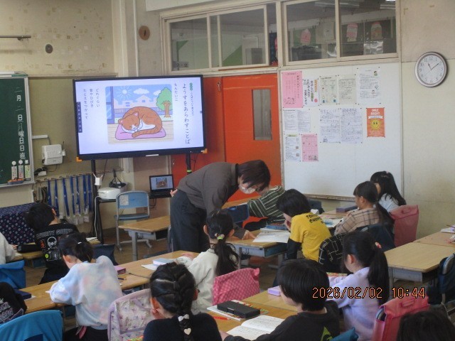2組の3時間目の国語の授業は、「ようすをあらわすことば」の学習で、イラストや映像に描かれている様子を、他のものにたとえたり、音などで表現したりして文章にする課題に挑戦です。先生の発問に子供たちはしっかり反応しながら、自分なりに考えて文章を作ります。友達とペアになって発表し合い、友達のよい表現を紹介するなど、意欲的に学習に取り組む様子が見られました。