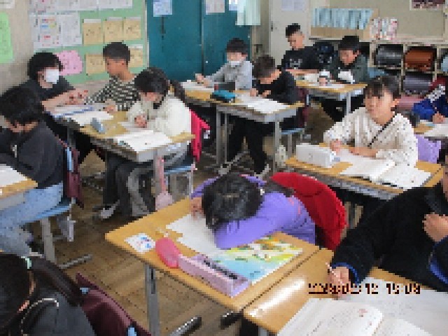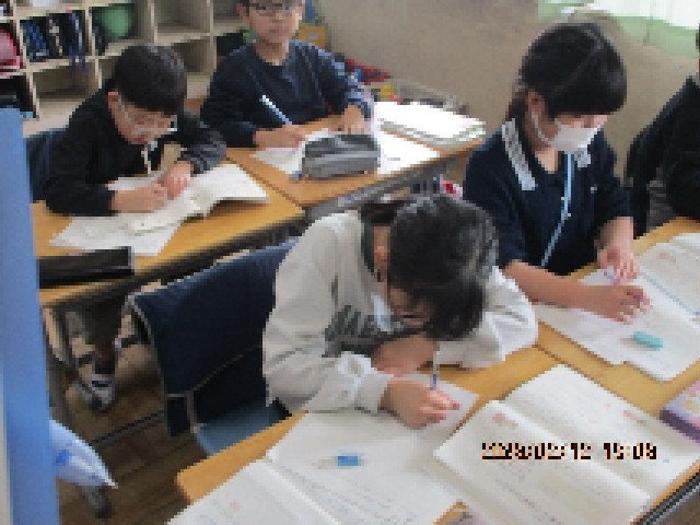 1組の午後5時間目の国語の授業は、「言葉から連想を広げて」の課題です。「にんじん」から連想するイメージを、五感や例えなどを使っていろいろな言葉で表現し、最終的に1行の詩にします。短い言葉で表現することの難しさを感じながらも、感性豊かな子供たちは意欲的に作品づくりに取り組んでいました。