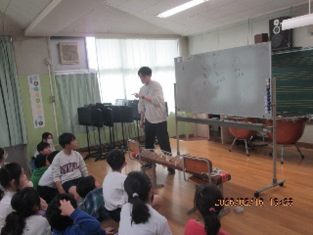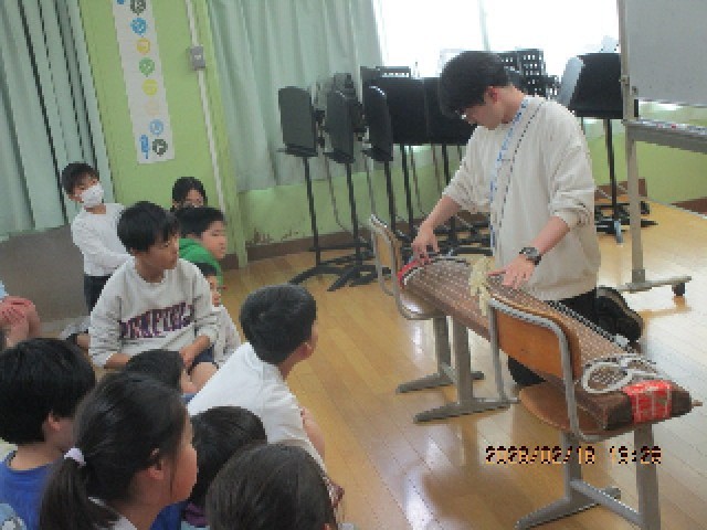2組の4時間目の音楽の授業は、「日本の音楽に親しもう」の単元で、箏について学習しました。本物の箏を前に、まずは各部分の名称や実際に弾くときの注意事項について学びます。4月に歌った「さくらさくら」を思い出しながら、先生が奏でる箏の音色をじっくり味わい、次時の活動への関心を高めていました。