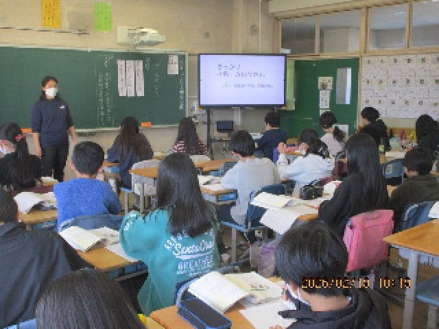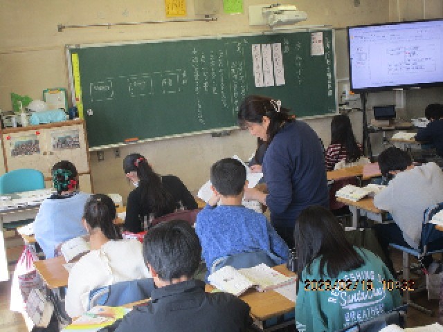3時間目の3組の国語は、「今、私は、ぼくは」の単元の学習で、与えられた課題についてプレゼンテーションするために、どのタイミングでどんな資料を見せると効果的かを考える授業です。先生が用意したプレゼンと工夫されたプレゼンを見比べながら、自分の発表に生かすための準備をします。考えが整理できた子供たちは、順次プレゼンテーションソフトを駆使しながら、発表資料を作成していました。