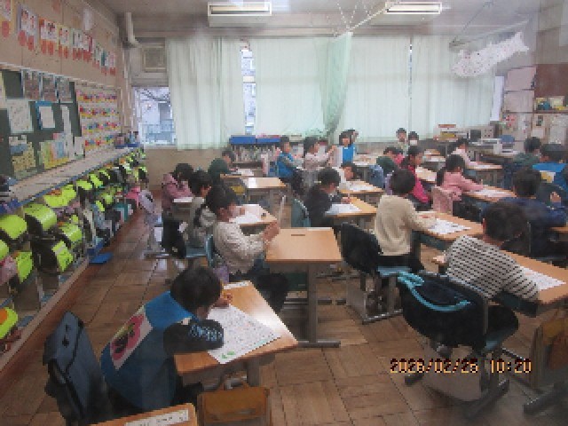 3時間目の1年生は、それぞれの教室で課題に一生懸命な子供たちの様子が見られました。この1年の楽しかったことを絵にしたり、ワークシートで整理したりと、それぞれが思い思いにふり返りながら課題に向き合っていました。
