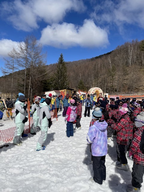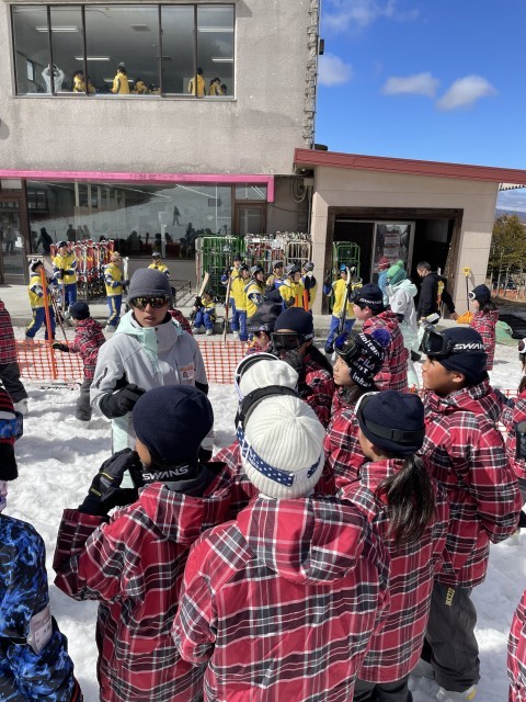 スキー教室の開校式が行われました。お世話になるインストラクターの方々に挨拶をし、いよいよ班に分かれて指導が始まります。