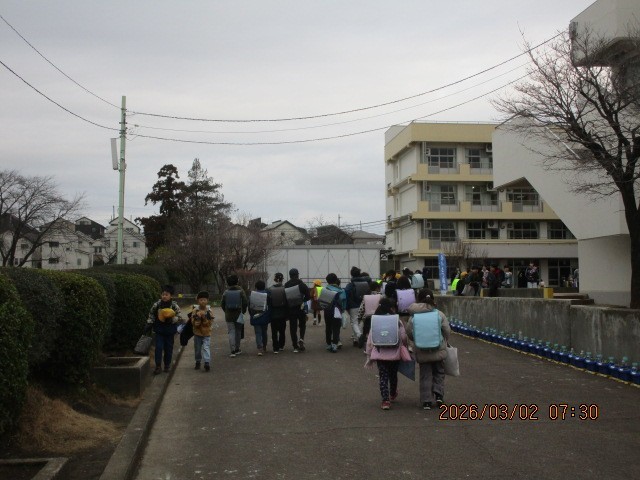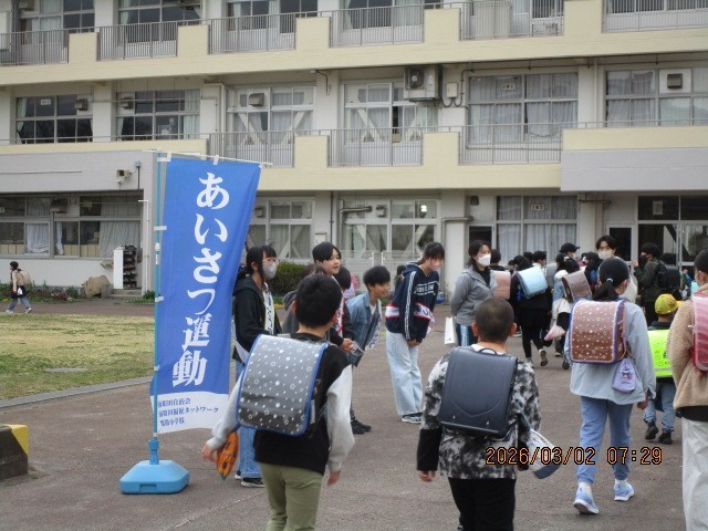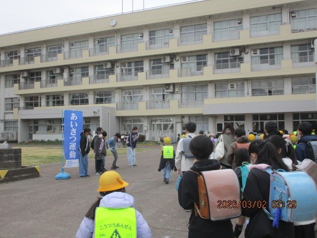 3月最初の登校です。今朝は代表委員の6年生が、昇降口付近で登校してくる子供たちを出迎えて、朝のあいさつをしてくれていました。卒業する6年生の、下級生に対する思いが伝わる活動です。登校してきた子供たちも、笑顔で返していました。すてきな3月のスタートとなりました。