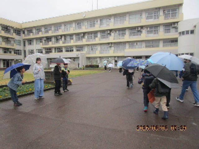 今日は朝から雨の1日になりそうです。昨日に続き、6年生のお出迎えを受けながら子供たちが登校してきます。今日は全校朝会もあり、早めの入室になります。傘の片付けも自分たちでしっかり行い、体育館に集合です。