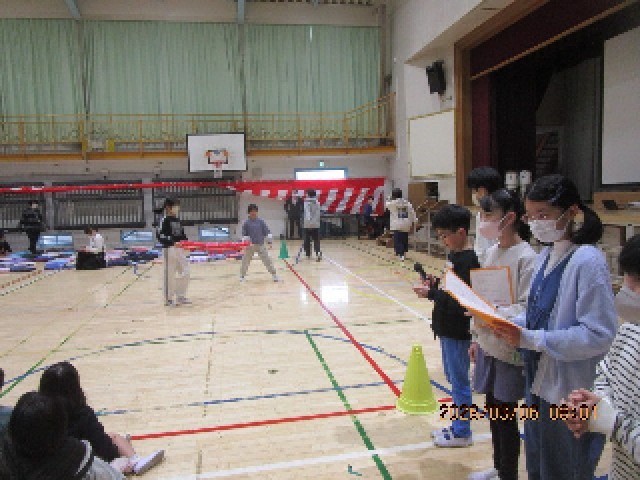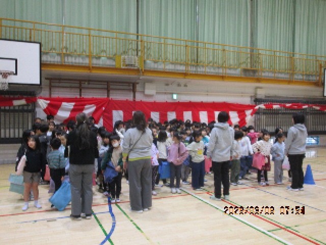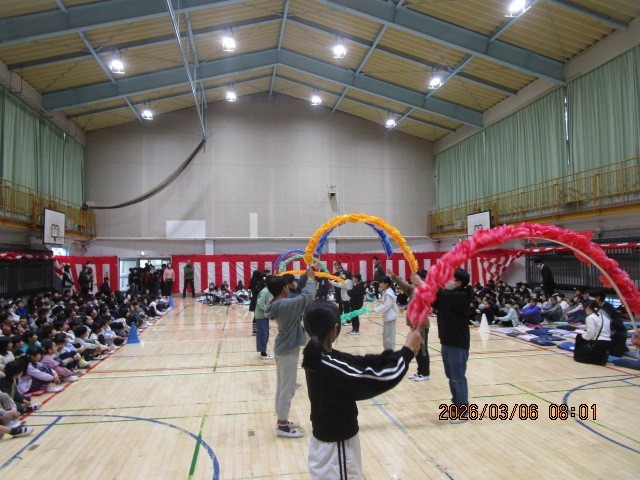 今日の1時間目は6年生を送る会です。卒業を目前にした6年生に、それぞれの学年の子供たちが感謝の気持ちを伝えます。司会進行は5年生の代表委員の子供たちです。花のアーチが準備され、6年生が入場します。