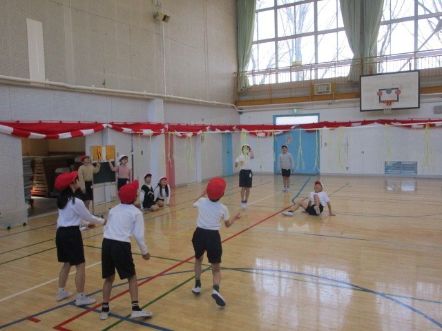3組の体育館での体育の授業は、ソフトバレーボールのゲームです。チームに分かれて作戦を考え、みんなで協力してゲームを楽しみます。メンバーで声をかけ合ってボールをつなぎながら得点をねらい、どの対戦も盛り上がっていました。3年生の体育の授業も残りわずかです。