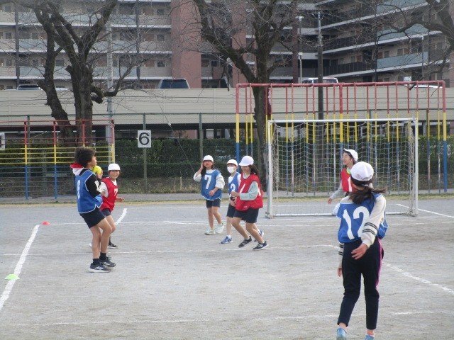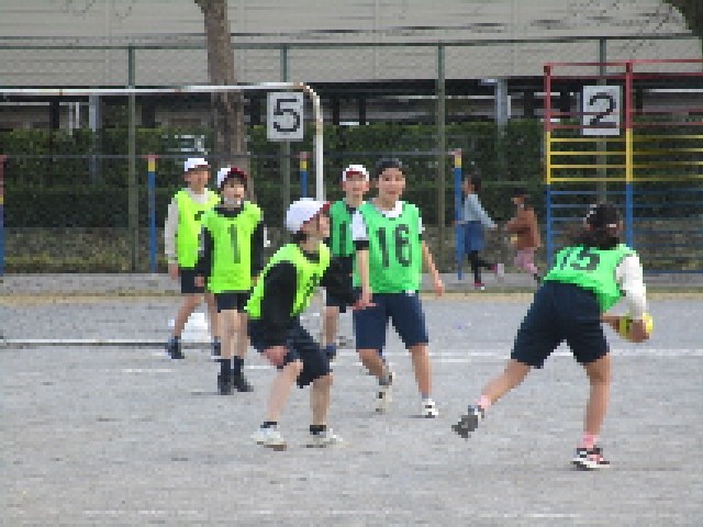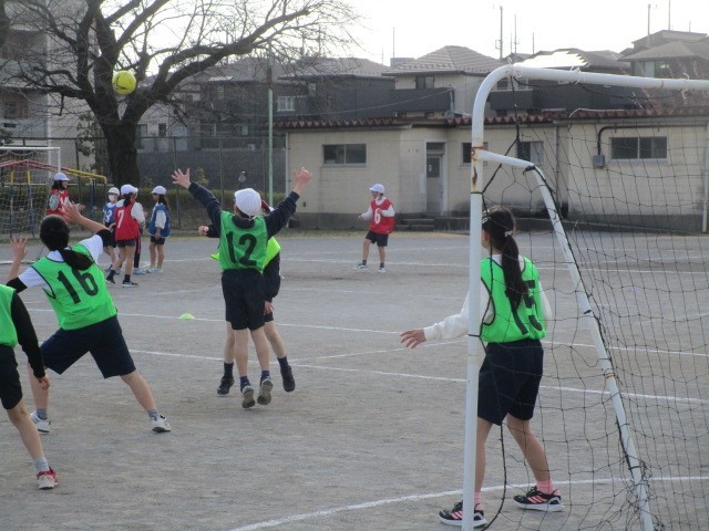 朝の雨がやんで、校庭では体育の授業もできるようになりました。午後5時間目の3組の授業では、ハンドボールの対戦が行われました。チームで作戦を話し合いながら、パスやシュートを工夫して得点をねらいます。上手にシュートが決まり、仲間同士でたたえ合っている様子も見られ、5年生のエネルギーが感じられる授業でした。