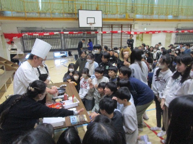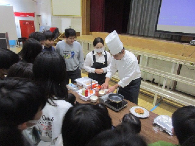 後半は、全日空で機長をされている本校の卒業生の方と、学区でレストランを経営されているオーナーシェフの方にご来校いただき、それぞれの職業についてお話いただきました。サービスでふわふわのオムレツの作り方を実演していただき、子供たちはプロの技と味を堪能していました。お忙しい中、本日は卒業する6年生のために、貴重な講演をしていただき、ありがとうございました。