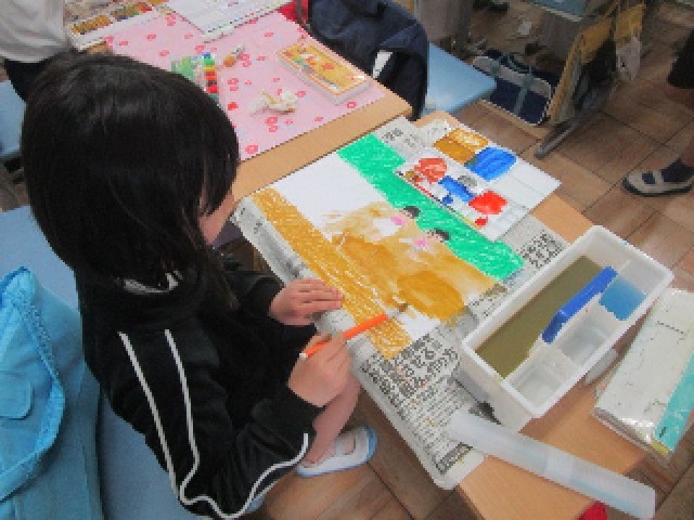 2組の2時間目の図工の課題は、「ようこそ あたらしい1ねんせい」と題して、この1年間お友達と過ごした時間を振り返って、4月に入学してくる新1年生に紹介する絵を描いていました。音楽会や運動会などの行事だけでなく、楽しかった授業のことも描かれていました。
