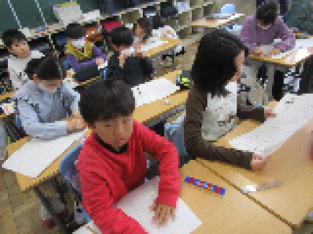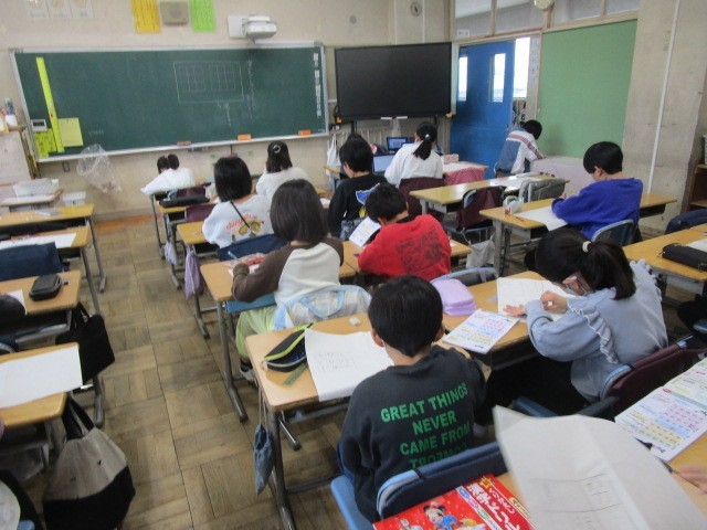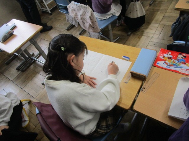 今日はそれぞれの教室で、テストの復讐など学習のまとめをやっています。4年生の教室では、漢字テストの問題を使って、漢字ビンゴを作っていました。今年習った漢字を楽しくマスターして、次の学年に進級しましょうね。