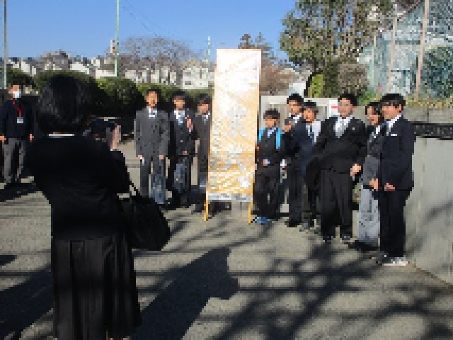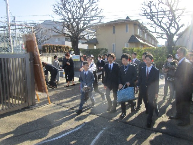 卒業式の朝です。きれいな青空が広がり、まさに卒業式日和です。卒業生が登校してきました。みんな笑顔です。