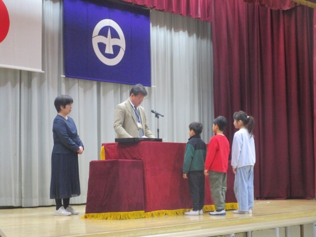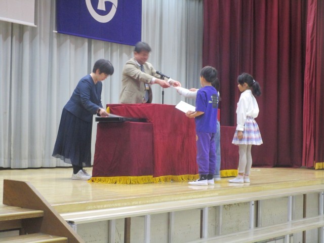 定刻通りに、修了式が始まりました。各学年学級の代表児童に、修了証が渡されました。