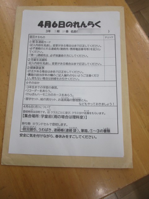 3月25日(水) 新年度4月に向けて 公開日 2026/03/27 更新日 2026/03/27 校長室より 各教室では、新年度4月に向けての連絡も連絡も行われていました。春休みの過ごし方についてのお手紙や、始業式の日の持ち物など、しっかり確認しておいてくださいね。 校長室より 新着情報