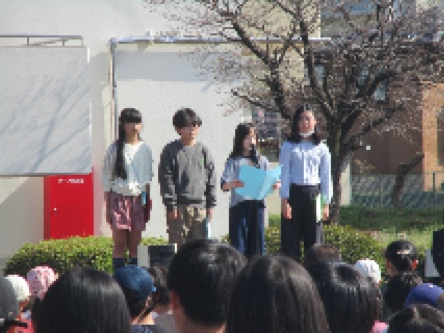 着任式の後は、1学期の始業式です。気持ちを切り替えて、校長先生の話を聞きます。今年も鶴間小は、人との「つながり」を大切に、1年間過ごしていきましょうというお話をしました。続いて、6年生代表による言葉です。最高学年としての自覚が感じられる、堂々とした発表をしてくれました。