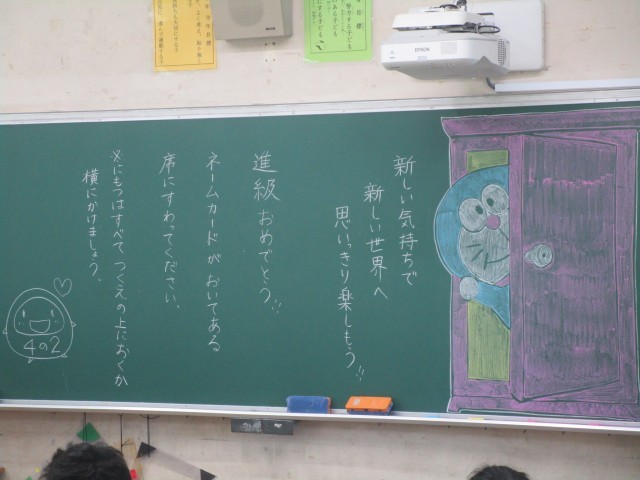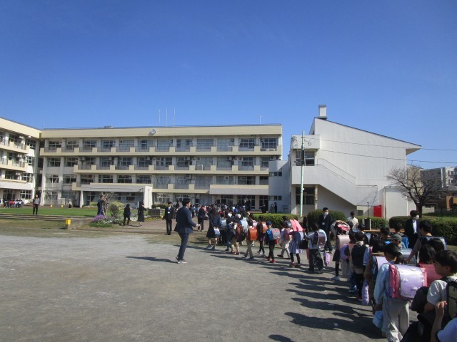 式の後、今年度から教室で学級指導が行われます。新しい担任の先生を先頭に、子供たちは新しい教室に入っていきました。