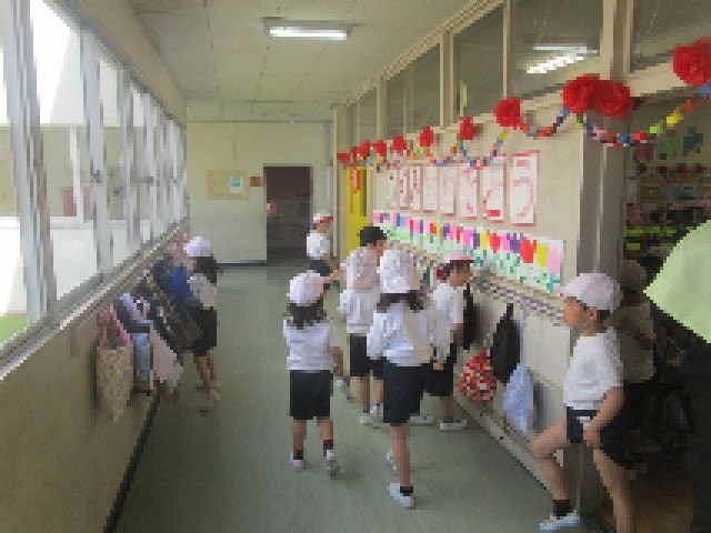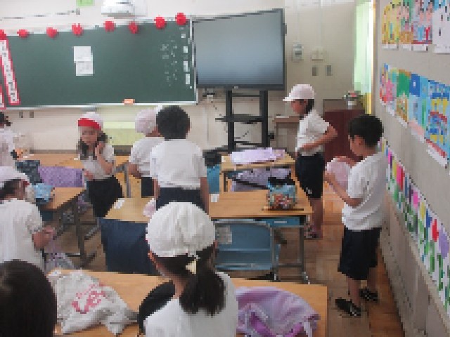 中休みの後の1年生は、体育着の着替えの練習をそれぞれの教室で行いました。服の畳み方や廊下にあるフックの使い方など、手順を確認しながら、上手に着替えることができていました。これで明日から体育の授業もできます。