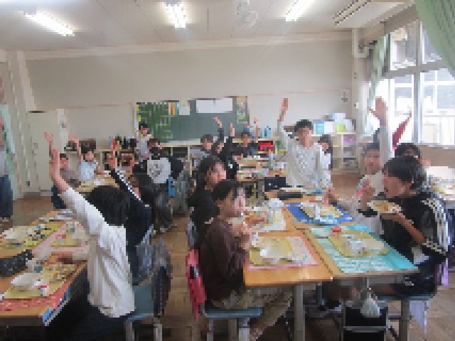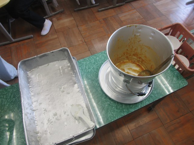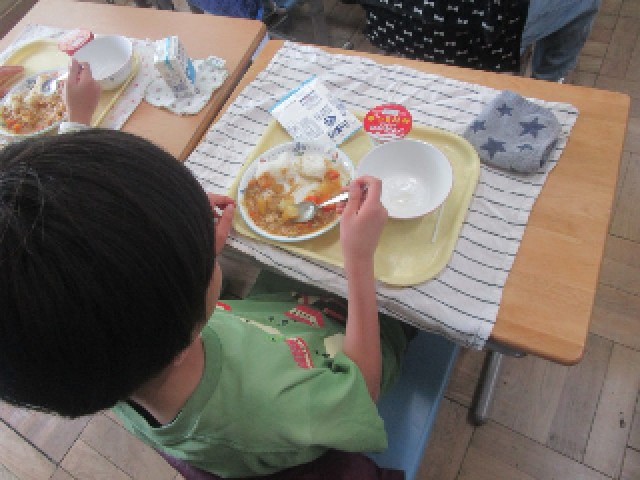 給食2日目、今日のメニューは、子供たちの大好きなカレーライスです。今年のカレー、どこか少し違うことに気付いた子供たち。お肉がとても柔らかくておいしいです。もちろん食缶は空っぽになりました。