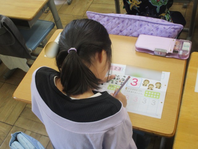 2組の算数の授業は、数字を正確に書く課題に取り組みます。お手本を見ながら、ゆっくり丁寧に練習します。2や3は、曲線をバランスよく書くのが難しいようですが、何度も繰り返し練習して上手に書けるようになりましょうね。