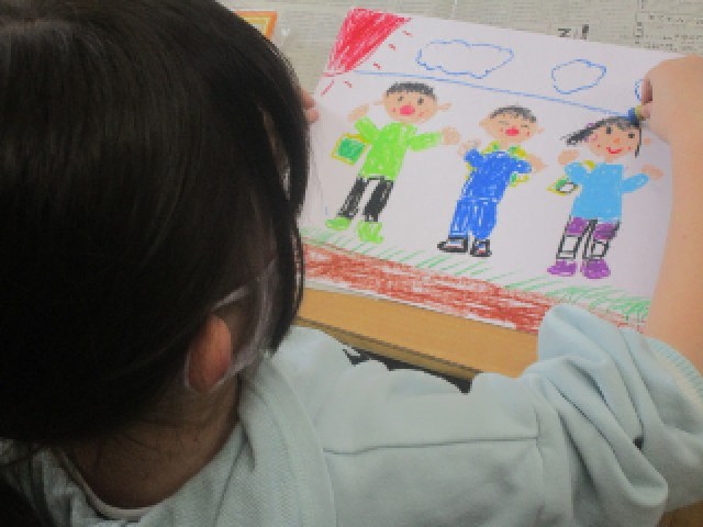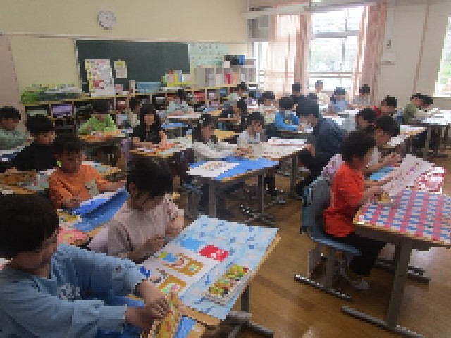 3組の図工の授業は、「みんなの好きなこと」と題して、クレパスを使った絵を描きます。学校の行事のことや家族で水族館に行ったときのことなど、楽しかった思い出や大好きな活動などを、いろいろな色を使って描いていました。みんな集中して取り組んでいて、どんどん仕上がっていました。