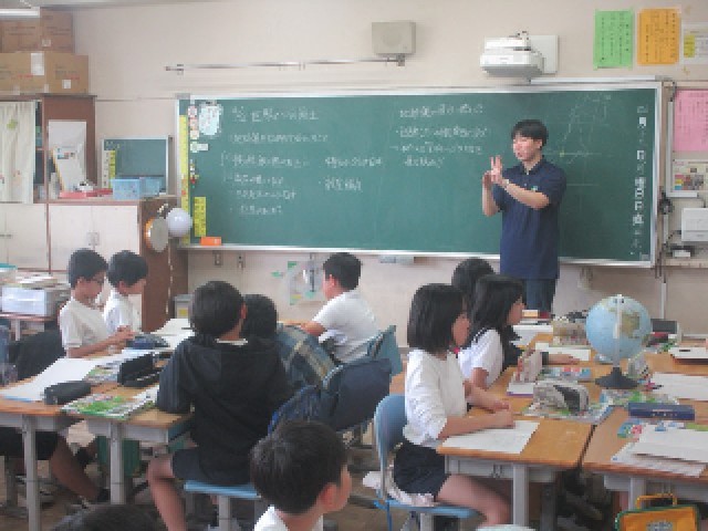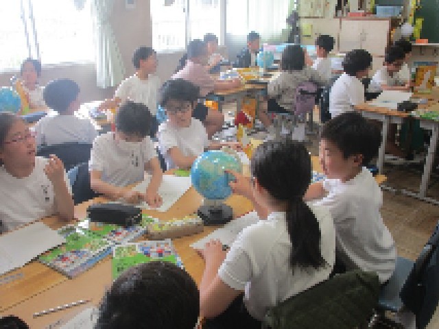 2組の社会科の授業は、「わたしたちの国土」の授業の2時間目です。今日は班に分かれて、地球儀を使って日本の位置を、経度と緯度を使って調べる課題です。新規採用の先生は、1時間の授業の展開を考えながら、子供たちの興味・関心を引き出そうとしていました。今後も日々の教材研究に励んでいきます。