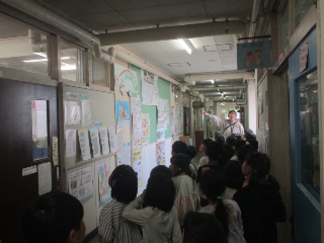 3時間目の4組の子供たちは、自分の教室を飛び出して、校舎内や校庭などを探検しました。校長室や職員室などの様子を見学して、天気のよい校庭に出て、敷地内のいろいろな場所を歩き回りました。広くてとても1時間では回り切れませんでしたが、また時間をかけて探検してくださいね。