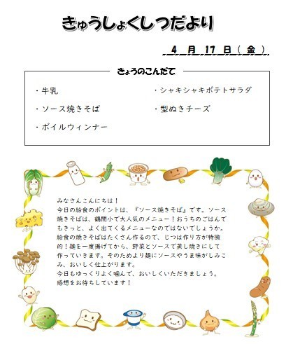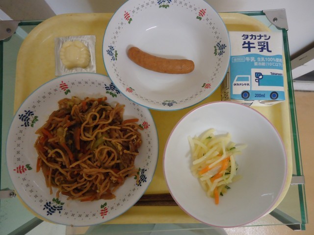 2026年4月17日の給食 公開日 2026/04/17 更新日 2026/04/17 給食室より ※写真は1年生の盛り付け量になります~今日の献立~牛乳ソースやきそばボイルウィンナーシャキシャキポテトサラダ型抜きチーズ 給食室より