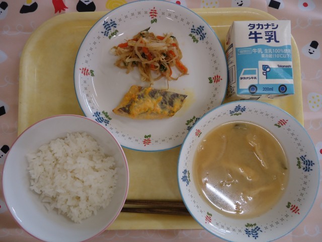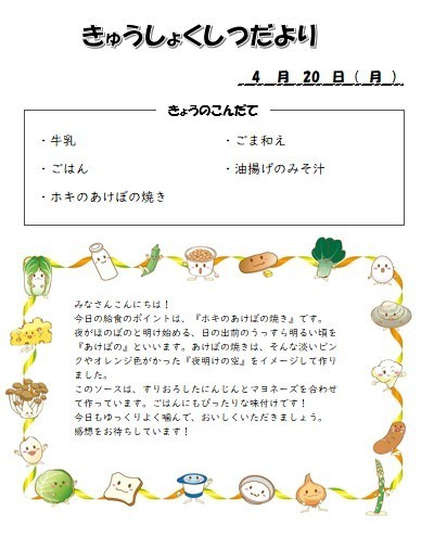 2026年4月20日の給食 公開日 2026/04/20 更新日 2026/04/20 給食室より ※写真は1年生の盛り付け量になります~今日の献立~牛乳ごはんホキのあけぼの焼きごま和え油揚げのみそ汁 給食室より