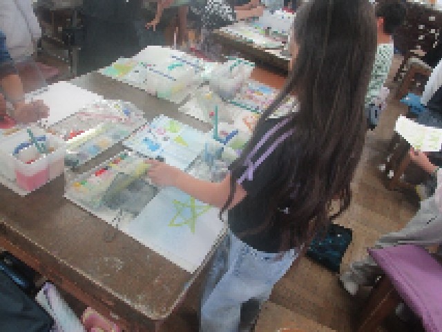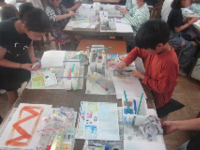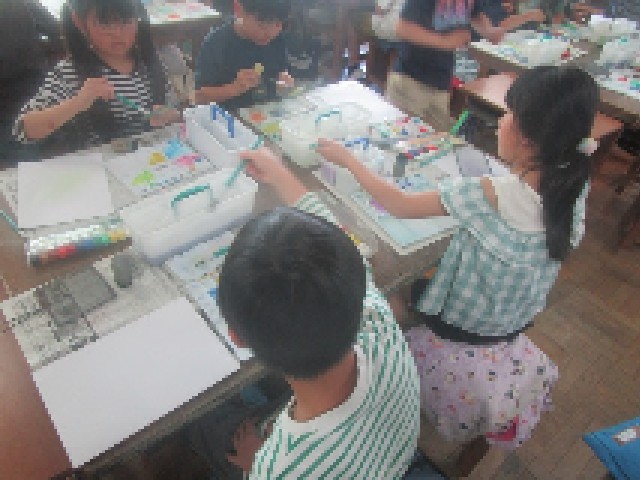 2組の3・4時間目の図工の授業は、「いろいろな絵の具研究所」と題して、網やブラシなどを使ったスパッタリングという技法で、絵の具の模様をつけた紙を作り、そこに自由に作品を描いていく課題です。これまで試したことのない絵の具の活用の仕方に、子供たちは興味を深め、意欲的に作品づくりに励む姿が見られました。