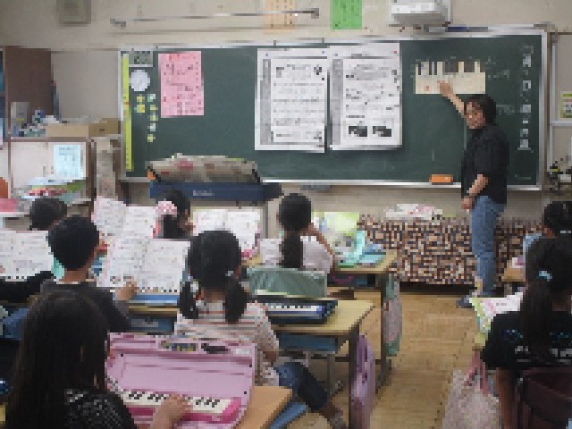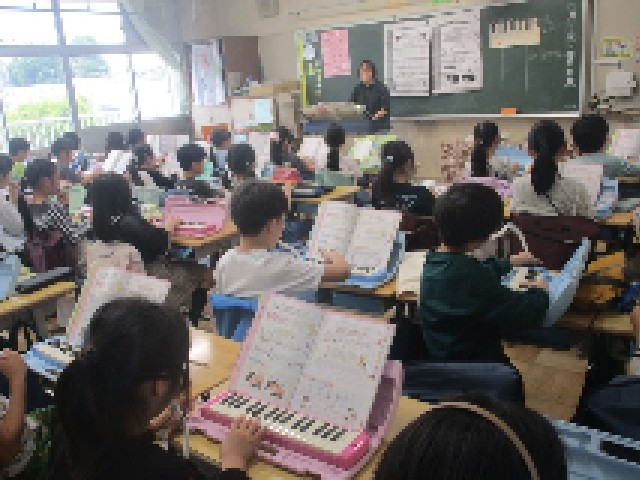 3組の2時間目は音楽の授業で、鍵盤ハーモニカの練習をしました。運指について繰り返していねいに指導を受けながら、子供たちは練習曲を先へ先へと進めたくて仕方ない様子でした。