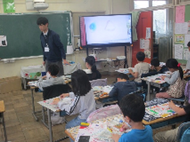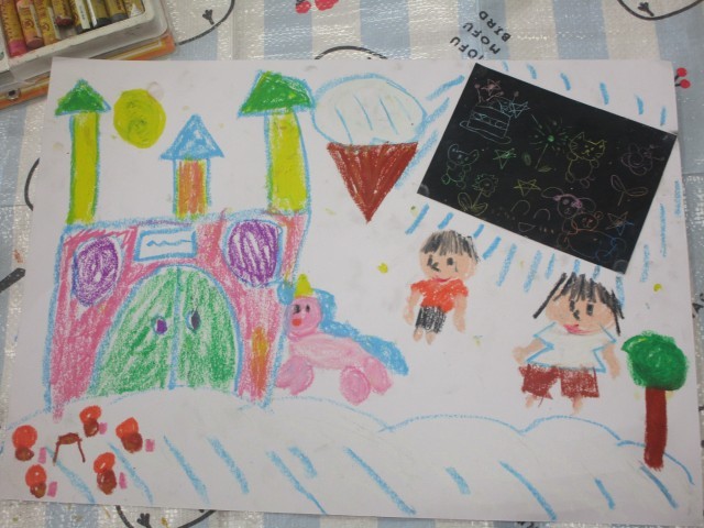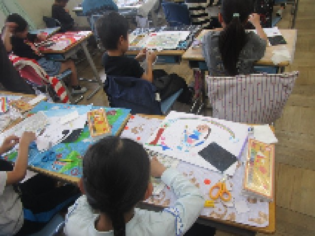 1組の3・4時間目の図工は、「らんらんランド」と題した課題です。クレパスを使った作品づくりに一工夫。ぼかしの型を作って、その型とティッシュペーパーでぼかしを入れます。何とも独特な風合いの作品に仕上がり、みんな出来映えに満足そうでした。