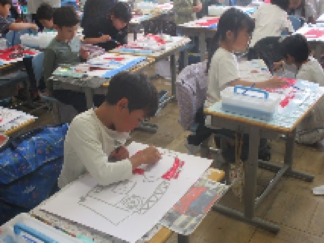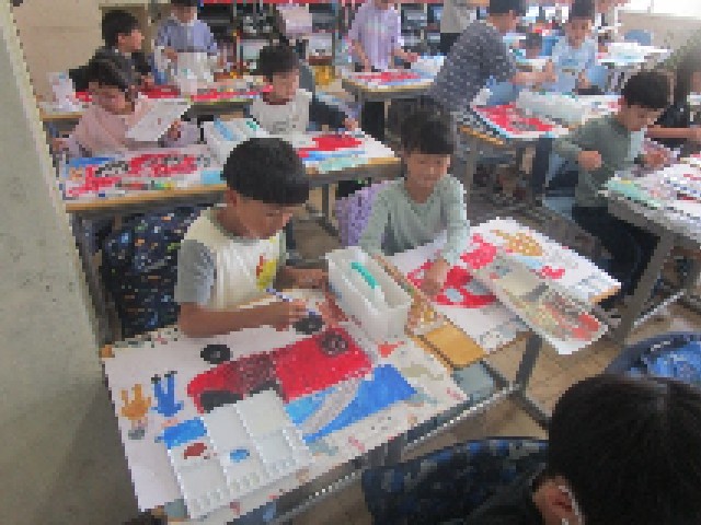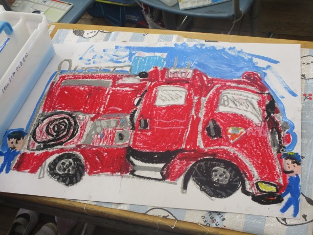 1組の教室では、先日行った消防写生会の作品の仕上げを行っていました。メインの消防車や消防士さんの服などはしっかり描けていて、着色もされていたので、今日は背景や細かい所の様子を思い出しながらまとめていました。どれもすてきな作品に仕上がりました。