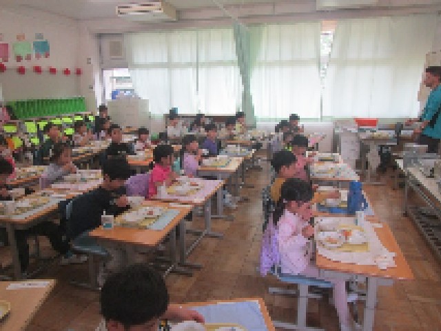 楽しみな給食の時間になりました。配膳の時間を利用して、給食のメニューや音楽などを流してくれるのは、5・6年生の委員会の子供たちです。今日も放送を聞きながら給食の準備をし、おいしくいただきました。
