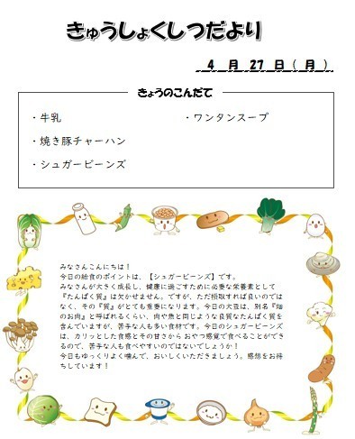2026年4月27日の給食 公開日 2026/04/27 更新日 2026/04/27 給食室より ※写真は1年生の盛り付け量になります~今日の献立~牛乳焼き豚チャーハンシュガービーンズワンタンスープ 給食室より