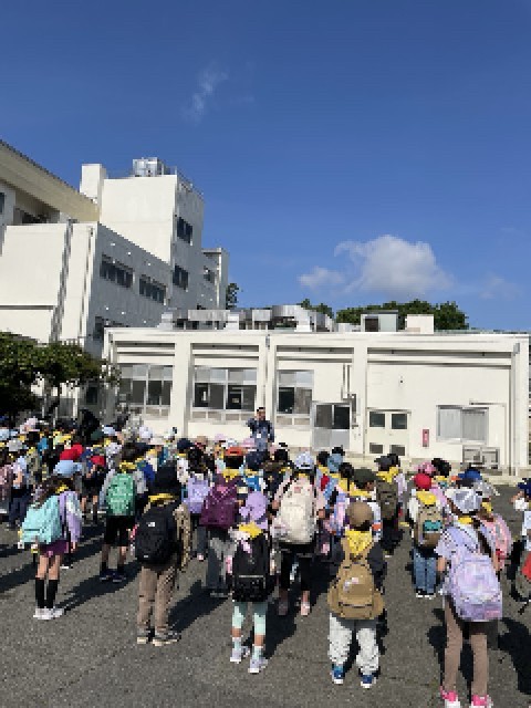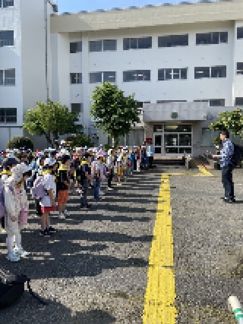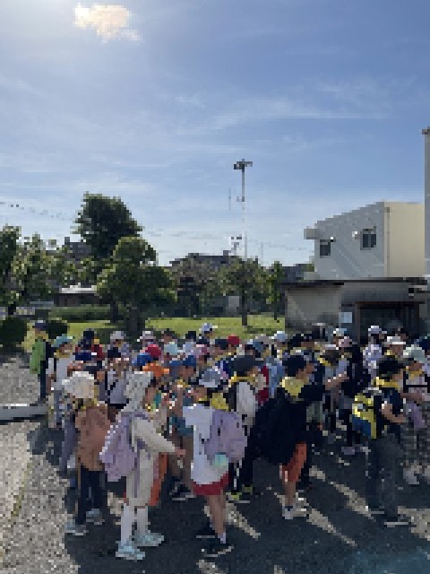 今日は2年生が遠足で、こどもの国に行きます。絶好の遠足日和になりました。出発式で、今日のめあてを確認しました。