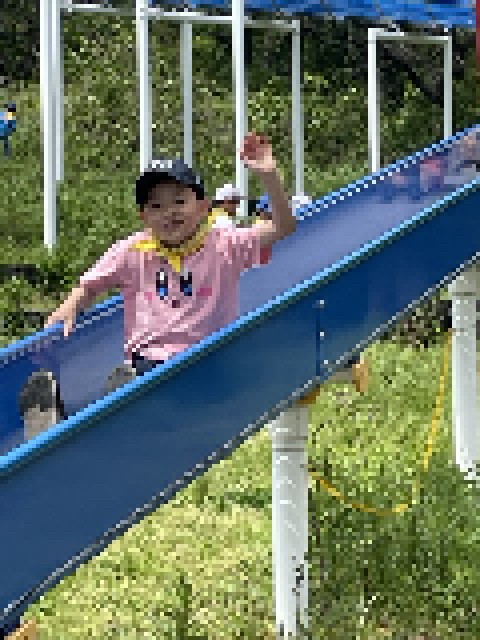 お腹いっぱいになった後は、もうひと運動です。こどもの国名物のローラー滑り台に挑戦します。