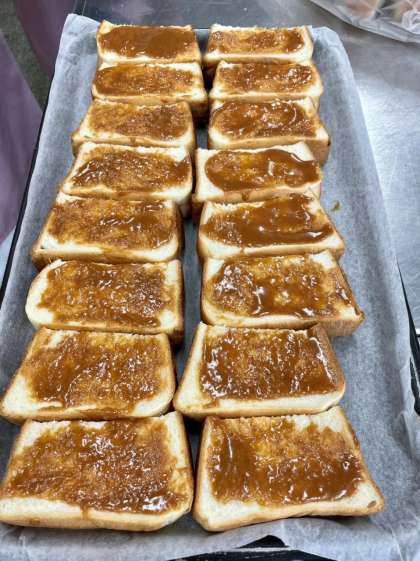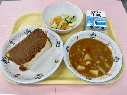 今日は久しぶりにパンの献立でした。手作りのきな粉ペーストを厚切りの食パンに塗ってこんがり焼いたきな粉トーストは、児童からも職員からも大好評でした。現在、給食時間中はどのクラスもお喋りをせず黙食をしているのですが、わたしが教室に顔を出すと、たくさんの児童が声を出さずに「グッド」や「これが美味しい」のジェスチャーをしてくれました。