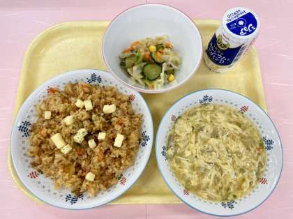 今日の給食室は、朝からタコライスの具を炒める良い香りが漂っていました。豚肉とチリパウダーの食欲をそそる香りでした。タコライス風まぜごはんはひき肉と玉ねぎをたっぷり使用したので、いつもより主食の出来上がり量が多かったのですが、ほとんどのクラスがよく食べてくれました。