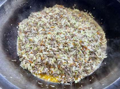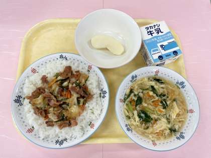 給食の豚丼は野菜をたっぷり使いますが、大きな釜でお肉と一緒に炒めるうちにカサが減り食べやすくなります。調味料にはオイスターソースを加えているので、今日のように暑い日でも食欲が増す味付けだったのではないかと思います。