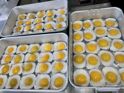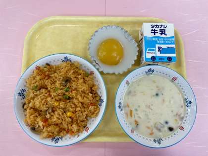 今日はおかしな目玉焼きを作りました。鶴間小の給食に登場するのはとても久しぶりだったので、高学年の児童でも「おかしな目玉焼きってなんだろう?」と気になっているようでした。この目玉焼き、実は乳酸菌飲料で作ったゼリーの中に黄桃が入っています。見た目のインパクトがあるので、展示食を見に来た子どもたちは興味深々。給食時間中に巡回をしていると皆ワクワクした様子で食べてくれていて、こちらも嬉しくなりました。学校給食には、栄養素の摂取や食育など様々な役割がありますが、「明日の給食楽しみだな」と、児童にとって学校生活における楽しみのひとつにもなってくれるように、ときどきこのような面白い献立も取り入れています。