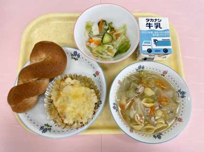 「ポテトのチーズ焼き」は、ジャーマンポテトのような具をカップに入れ、上からチーズを散らしてオーブンで焼いて仕上げました。久しぶりにパンを取り入れた洋食の献立に、子どもたちも嬉しそうでした。
