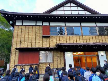 中禅寺湖、湯本温泉、金精峠と絶景続きのバス旅を終え、ついに宿舎の環湖荘に到着し、開校式を終えました。