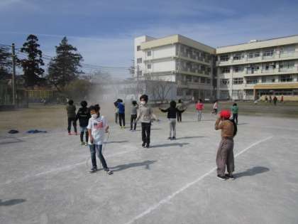 昼休みの校庭では、砂埃にまみれながらも大勢の児童が外で体を動かしていました。